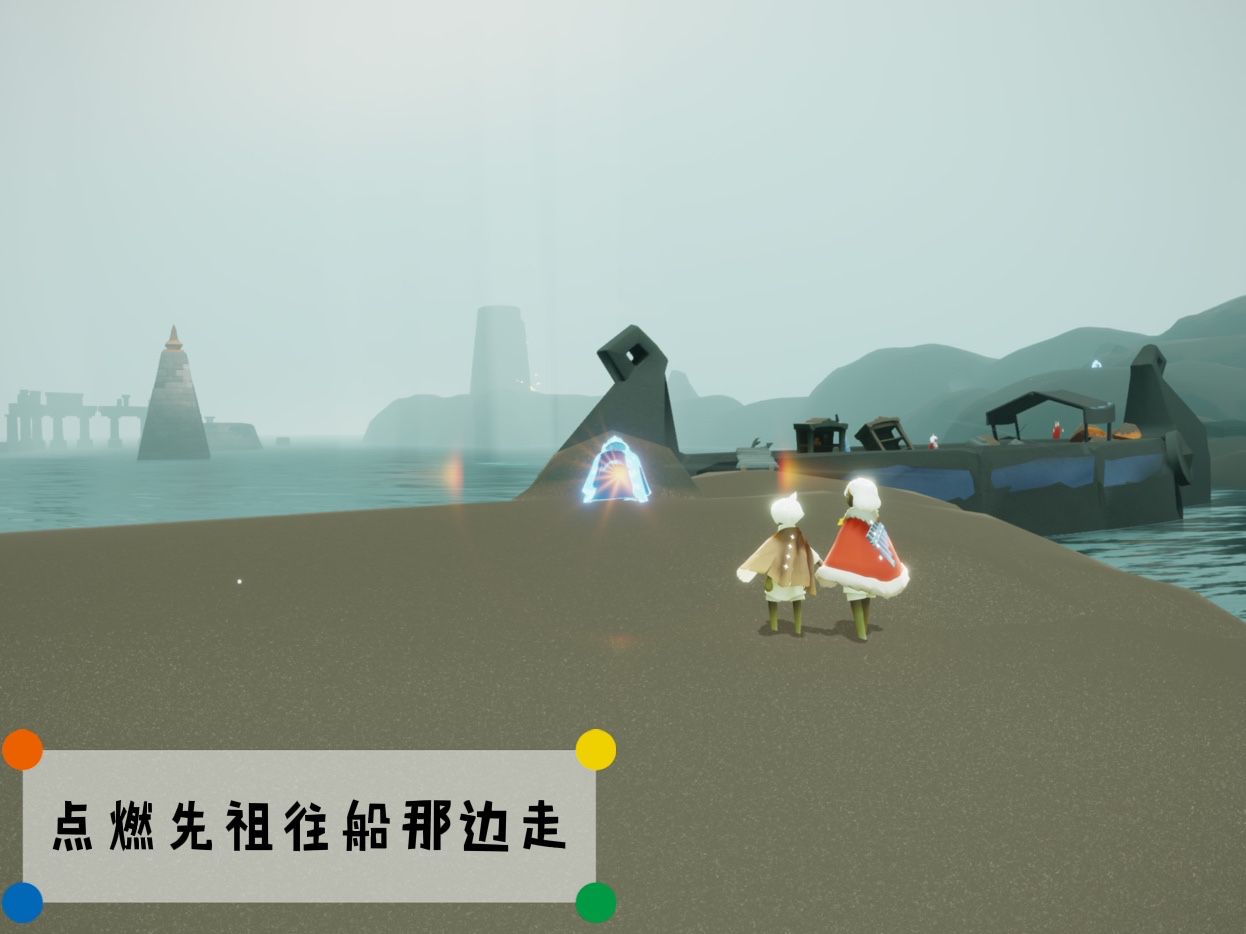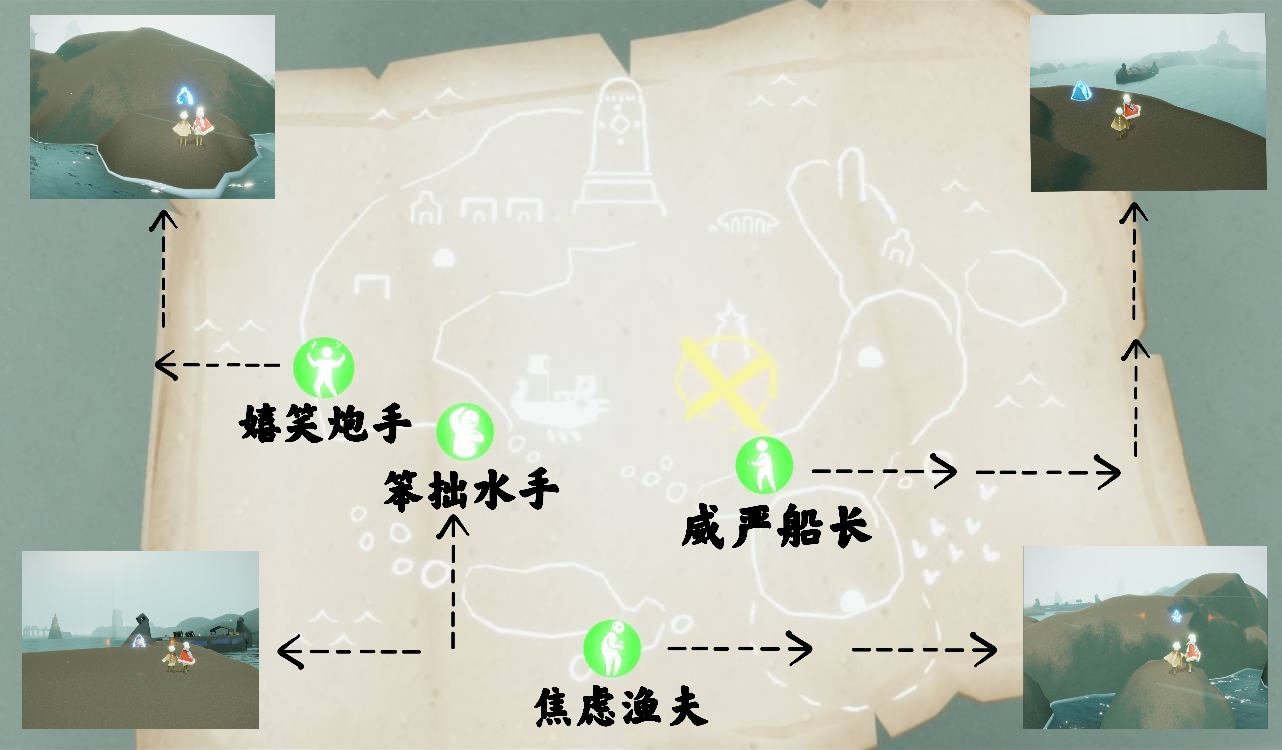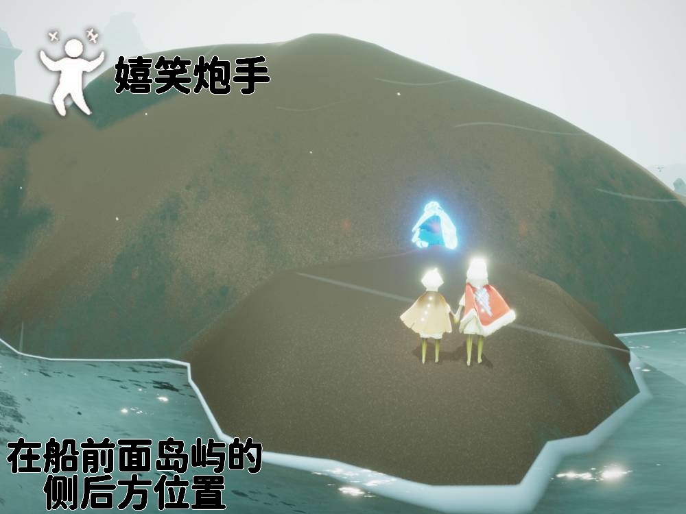 嬉笑炮手:位于船前面岛屿的侧后方位置。点燃先祖后,向上走并多次跟随先祖向前走,最后原路返回后触碰任务。