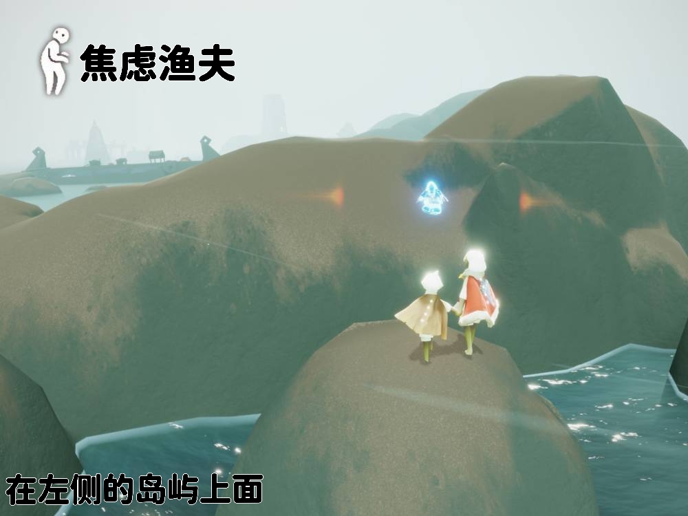 焦虑渔夫:位于左侧的岛屿上面。点燃先祖后,跟随先祖往右边、礁石走,之后在礁石区域多次跟随先祖移动。