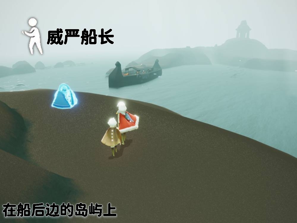 威严船长:位于船后边的岛屿上。点燃先祖后,向右边、前面走,进入山洞后出来,前往建筑和高塔路,最后在高塔上方完成触碰。