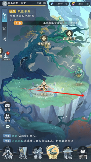 探索洞府:在洞府中,玩家可以进行多种活动,如修炼、使用罗盘、炼丹等。向左滑动屏幕,会发现更多玩法,包括神念禁制。