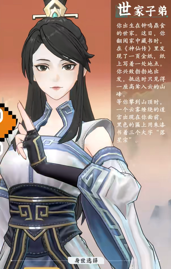 性别和身世:游戏提供世家弟子、江湖游侠、一方富商等不同身世,每个身世对应不同的初始服装和发型。