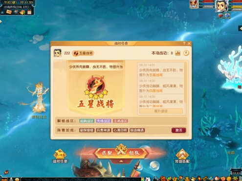 江海阵线暂时封锁,少侠们誓师集结,决战正式开启!双方主将将根据各位少侠当前的战勋,进行战时任命:卫兵、先锋、千夫长、1-5星战将。在战区征战提升战功,晋升职务,激活阵营加成效果,获取更高的战功和奖励。