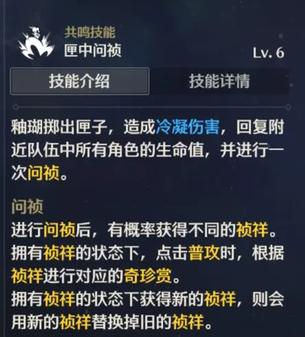 功能:回复队友生命,并进行问祯,随后获得祯祥。