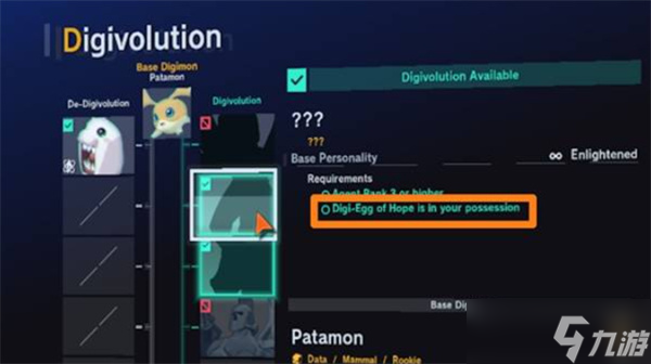 当所需数码蛋存在于物品栏时,该进化条件会自动高亮,表示可直接进行进化操作,无需手动选择。
