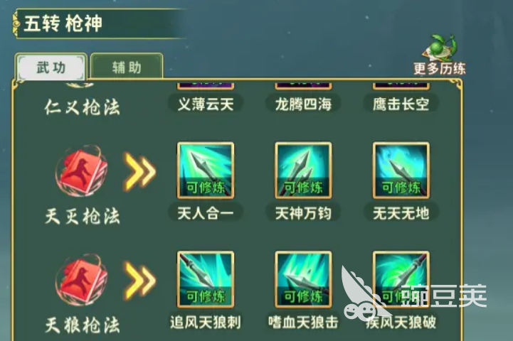 3转去点满增加攻击力的“乾坤挪移”,乾坤挪移是输出的关键核心,但如果打PVP的会更加建议能提升生命值的横练太保,4转点增加伤害的怒意之吼以及末日狂舞,5转点增加武功防御的灵甲护身。