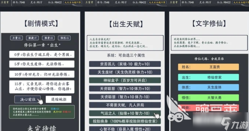 玩家每次开局都会面临全新的随机设定,从孩童时期的奇遇触发到拜师门派,完整模拟修仙的一生,游戏提供仙魔两条清晰的修炼路线,选择仙道可习得浩然正气的防御与净化法术,堕入魔道则能掌握瞬间爆发的攻击与控制奇术,不同路线不仅解锁差异化功法,还会影响道侣互动剧情与结局走向。