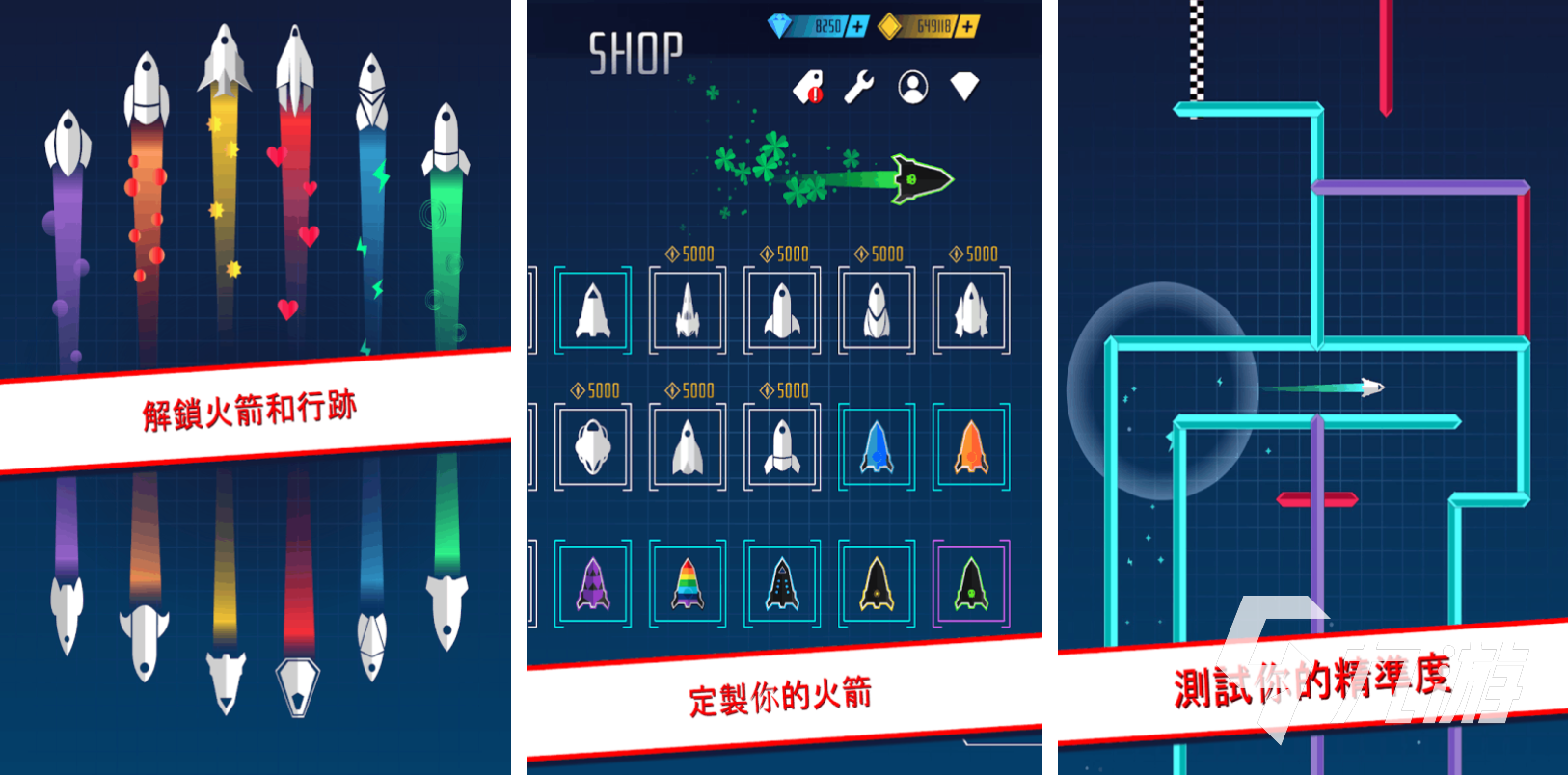 这是一款快节奏的躲避类小游戏,玩家需要操纵火箭在炫酷的赛道内调整方向、进行障碍物的躲避。游戏整体的设计风格和游玩方式都比较简单,不过玩家们在行进的过程中可以拾取金币和道具,每一局结束也会获得相应的金币奖励,然后就可以用这些金币去对火箭进行升级改造,提升其速度,还可以购入各样式的拖尾,让飞行的轨迹看起来更加多彩。