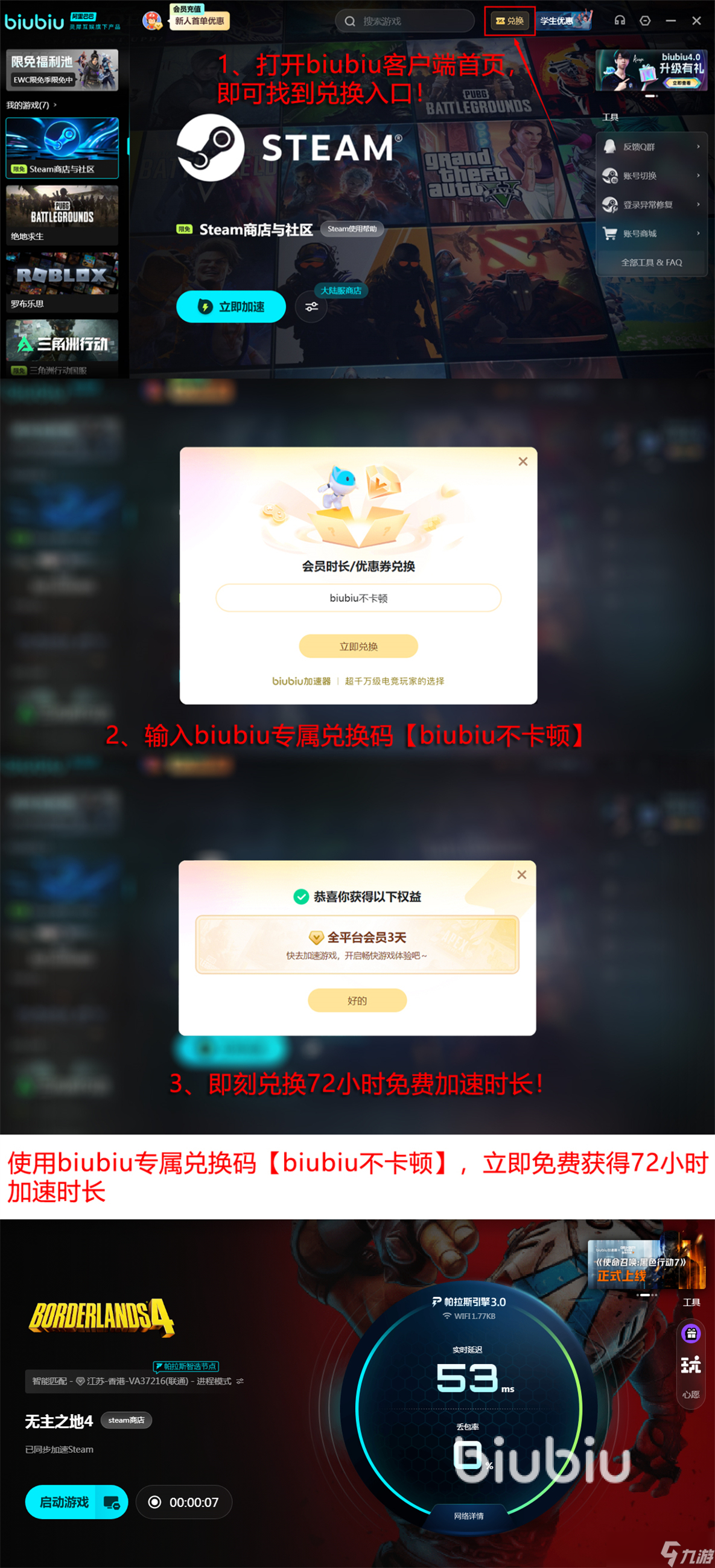 biubiu加速器独有的多路+多倍发包的技术,还有大数据预判重传,使用高速专网进行连接等,都集中在了自身的引擎中,随时应对各种复杂的网络情况。如果对于这样的效果还有所怀疑,那么就抓紧注册一个新号,利用新号免费加速24小时的福利去尝试一下。如果感觉24小时还不过瘾,那么兑换码【biubiu不卡顿】一定要牢记,能兑换72小时加速时间,而且兑换码是每个号都通用的。