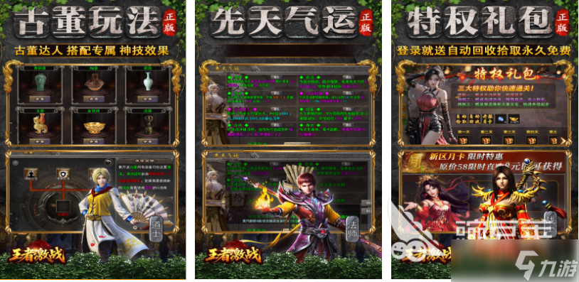 这款传奇系列的衍生手游作品玩法方面可谓特立独行,超级经典的背景塑造跟全新的玩法也形成了强烈反差,游戏有着比拼运气的抽奖机制可获得许多的时装,古董鉴定玩法的加入是其他传奇类游戏不具备的,极为经典的战斗元素将挂机战斗的玩法发扬光大,超级精彩的战斗环节更是王者激战这款APP的特色,回收装备进行售卖分解的游戏机制更为完善。