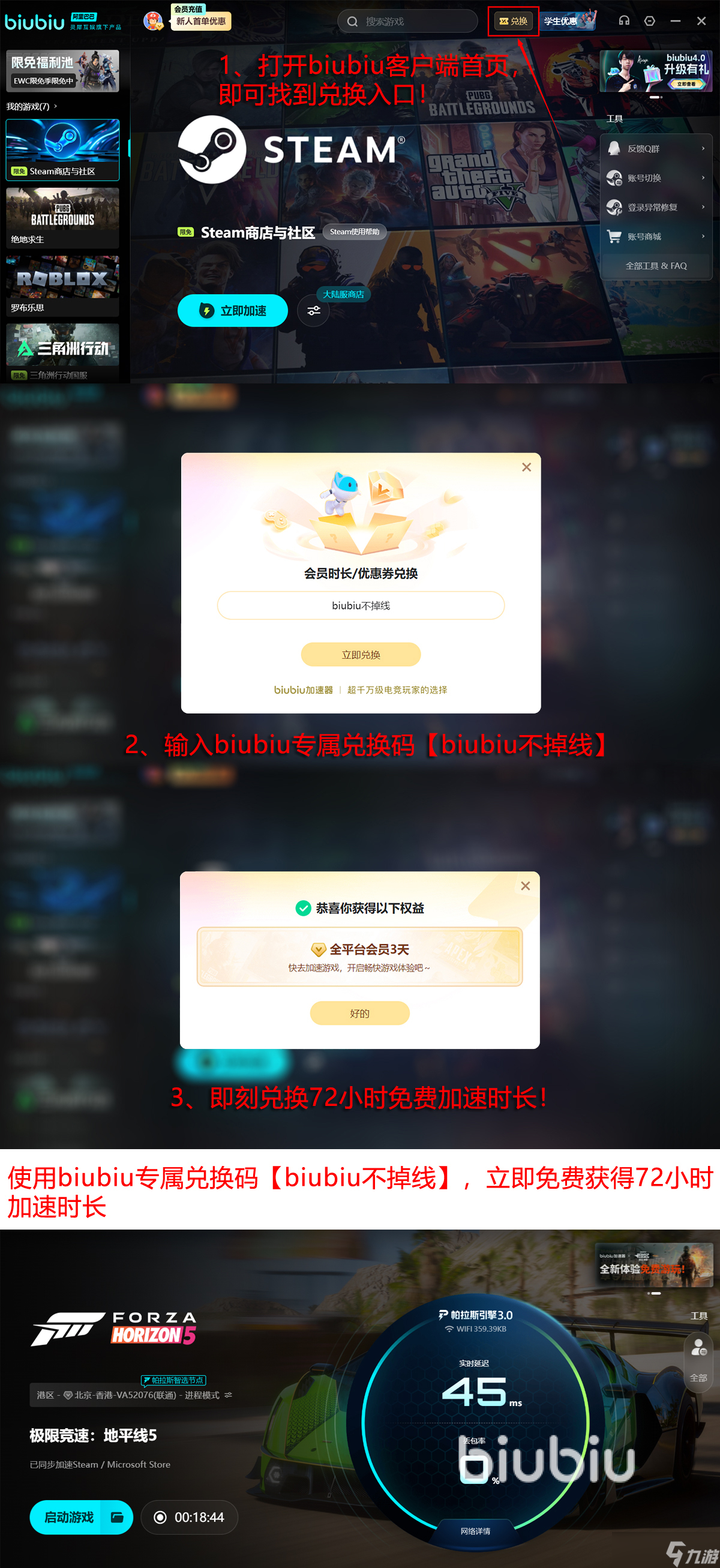 关键福利不能错过,新用户注册即送第一天助力无忧24小时,输入专属口令【biubiu不掉线】可再得免费加码时长72小时,两重叠加享受累计96小时无负担的网络体验,帮你彻底解决地平线5闪退卡顿问题。
