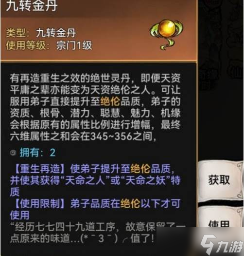 提到了【九转金丹】,就给大家讲讲金丹使用的一些小技巧吧。 我们可以点击上图所示的【使用】按钮,进入金丹服用后的预览界面