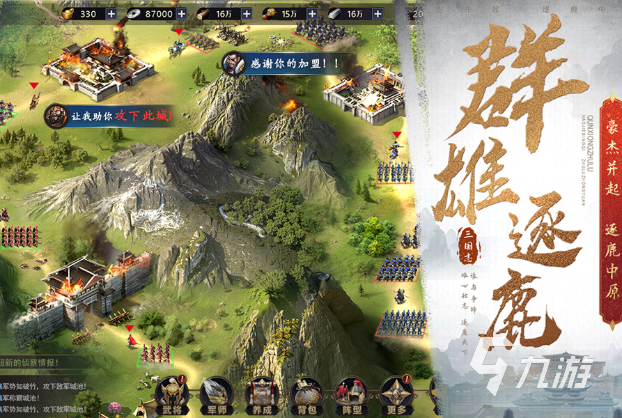 这是一款以三国为背景的策略战争手游。在游戏中我们可以体验到六大职业之间不同的战斗玩法,还可以招募武将,组成专属的作战阵容,去和敌人对线,抢夺资源。同时游戏还把兵马未动粮草先行的策略搬到了游戏里,让大家体验到三国真实战场场景。另外,游戏还有城池共建元素,感兴趣的小伙伴快快体验吧!