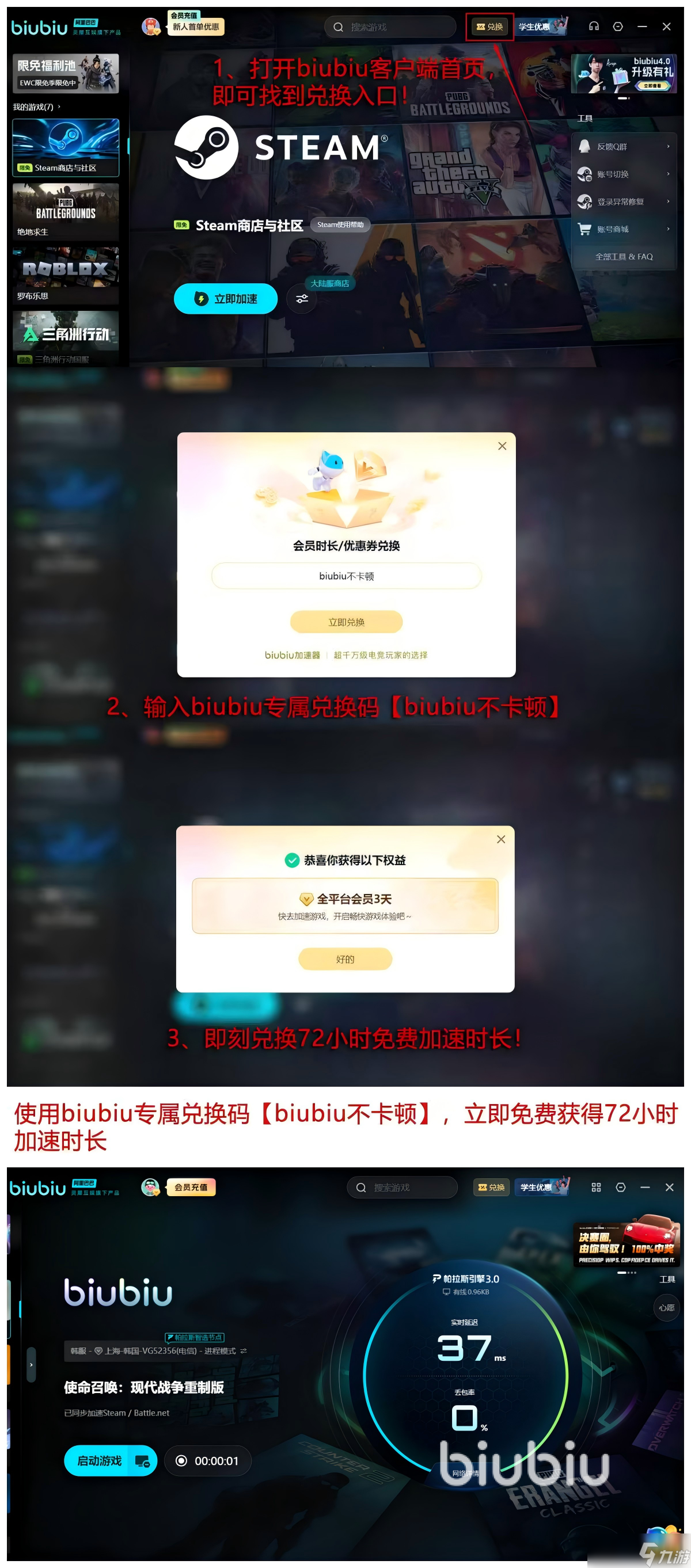 输入【biubiu不卡顿】暗语可以获取三天免费时长,再加上新用户的24小时加速时间,96小时的总计体验时光非常超值,对于不清楚加速效果的玩家来说绝对是非常靠谱的一个软件,在此基础上该游戏还在限免轮换的名单当中,有机会的话还有限免体验的机会,对于长期使用的用户非常的超值,绝对会在全年为大家省下一大笔的费用。
