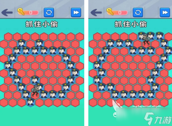 这是比较休闲益智,以警察抓小偷的这种剧情所设计,玩法非常的简单,你只需要在每个关卡当中,将小偷去路成功的赌注,只要小偷无路可逃,被围困在其中的情况下,自己就能顺利的完成任务。有特别可爱的小偷形象,甚至是穿着制服的警察头像。通过合理的安排,警察的位置,将小偷圈在中间的情况下,就可以抓住小偷。