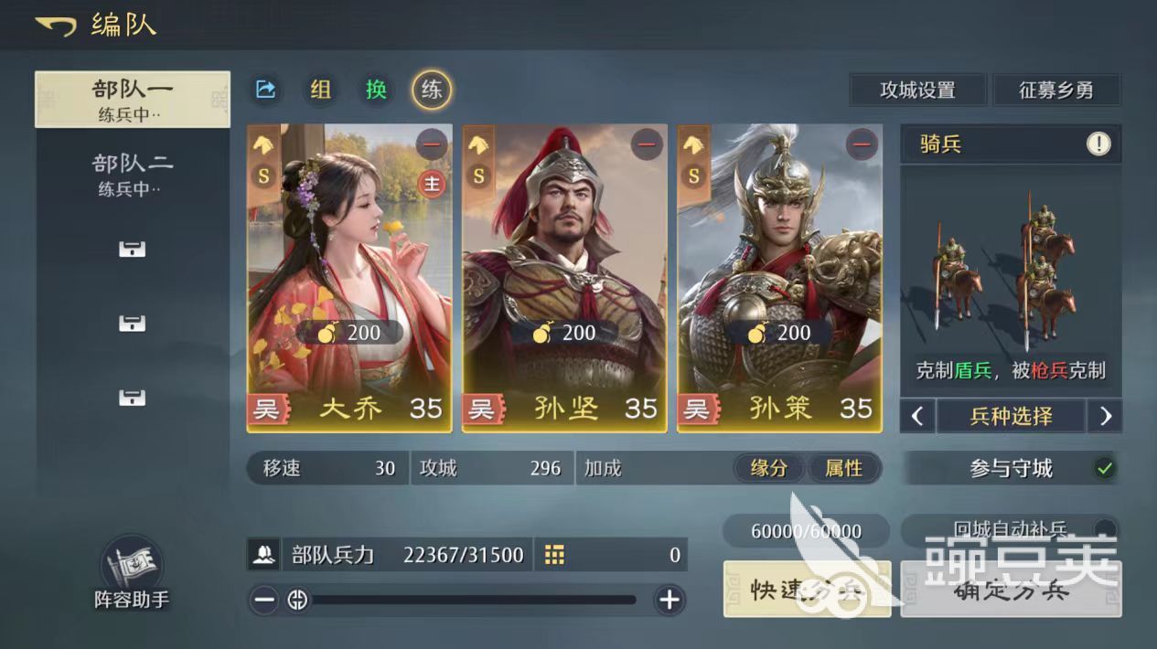 在游戏中,玩家可以通过参与首充直接获得大乔,然后在游戏中首日完成活动就能免费获得武将孙策和孙坚,这样就能在首日直接组成我们需要的首充队伍了。这套搭配首先是在强度方面够用,三个组成的武将都是橙色且都属于东吴阵营,这三个还能激活羁绊江东霸主。最关键的是这三个武将在兵种方面都达到了骑兵S级别。相信所有玩过这一类游戏的玩家,都会清楚三个S兵种适配性所带来的优势。兵种属性直接拉满。就意味着战力能最大限度发挥出来。