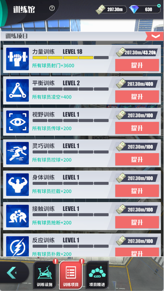 消耗训练资金可以提升各种训练项目,目前在训练馆种总共有10种训练项目,每种训练项目所能提升的球员属性也不同。每升一级都会给球队的整体实力带来显著的提升