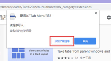 4、在搜索页面结果中找到“Tab Menu”扩展程序,点击后面“添加至Chrome”按钮进入下一页面。