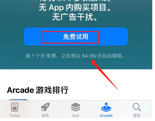 6、充值成功过后,我们在进入arcade页面,点击“免费试用”,