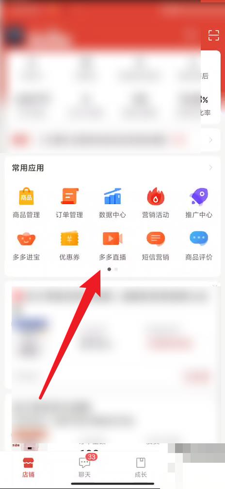 1、第一步:打开拼多多商家版APP,进入拼多多商家版主界面后点击【店铺】;