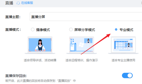 2、再自己起一个好听的直播主题,然后直播模式选择“专业模式”。