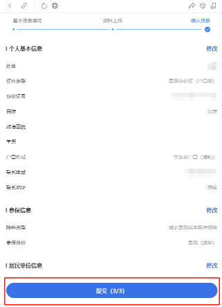 依次点击页面中摄像头图标上传居民户口簿主页、居民身份证或者其他有效证件的影像材料(可选择拍照或者从手机相册图片上传)后提交。