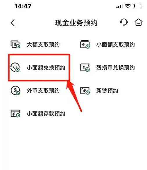 第二步:在现金业务预约页面点击【小面额兑换预约】即可。