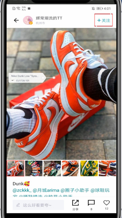 3、找到他人的动态点击进入,点击他昵称旁的关注即可