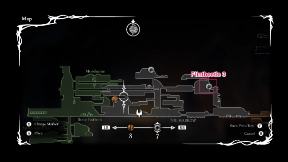 最后一只位于骸骨洞窟右侧区域,靠近可下劈跳跃的红色花丛及更右侧的BOSS斯卡加德。该区域从左路探索后可解锁捷径,并激活监狱上方的平台机关。