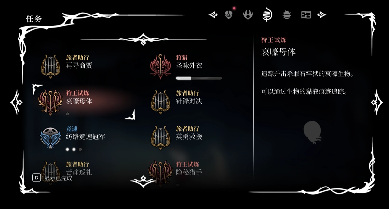 丝之歌狩王试炼哀嚎母体支线最后是去打boss暴怒兽蝇,推荐一定要带灵丝风暴,其它可以考虑带熔岩钟、磁石骰、碎面甲,最好在拿到二段跳之后再去打。