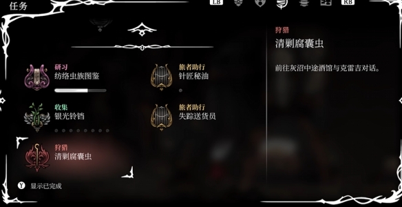 丝之歌中清剿腐囊虫是克雷吉在灰漠中心区域中途之家酒馆发布的狩猎任务,玩家需要向克雷吉交付25张破皮毛,击杀腐囊类敌人可以获取,因此也可以提前刷了再过去接任务直接交掉。