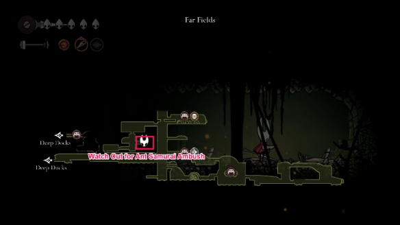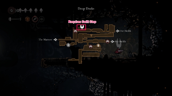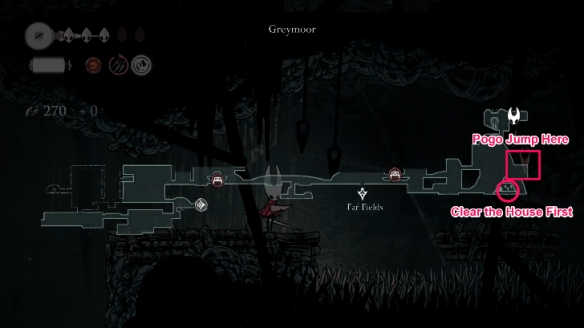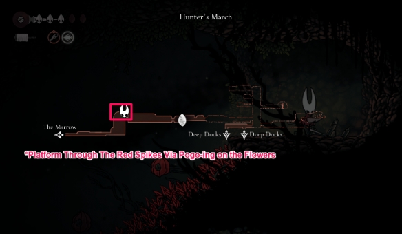 其中一只迷途跳蚤位于髓骨洞窟区域最高处,该区域在保存进度前不会显示在地图上。此区域为平台跳跃关卡,设有多重障碍与敌对虫族阻挡去路。