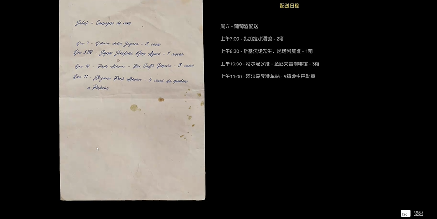 本篇为大家分享的是四海兄弟故乡第一章贵重物品配送日程的位置及获取方法,这个需要等玩家推进任务到跟随切萨雷到一个拱门处,外面有一些酒桶的地方,配送日程就在里面。