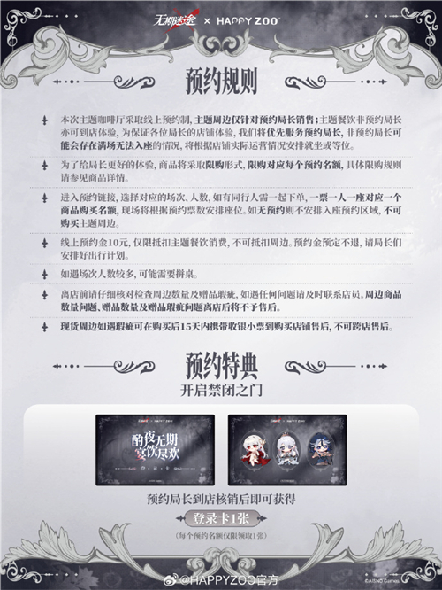 本篇为大家分享无期迷途与happyzoo的联动活动详情,这是第二期联动活动,与第一期相同,依旧是主题cafe的形式,另外还会上线三款联动皮肤和头像礼包,这次终于不是画了不卖了。