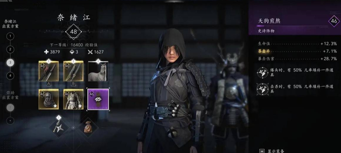 本篇为大家分享刺客信条影中奈绪江的无限飞刀流配装,这个流派的关键在于帽子、轻甲和饰物,尤其需要一个紫色饰物。