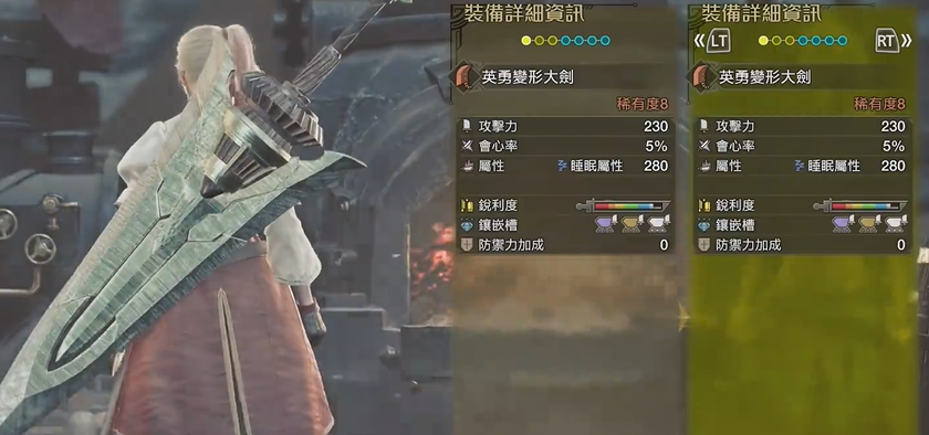 这把武器是配装的核心,其高基础攻击力和睡眠属性使其在输出和控制方面都有出色表现。机械大剑的面板攻击力可达230,是目前大剑中攻击力较高的选择之一,自带5%会心率,三个三级孔位以及20刀白斩,性能全面且强大。