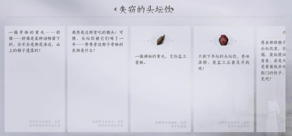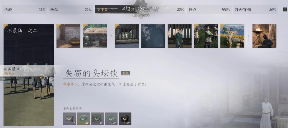 为大家分享燕云十六声武林录的探索任务中清河万事知任务不羡仙之二失窃的头坛酒的流程,这个任务完成后可以获得配方钝劣猎刀,需要在存香塔下与管事裴叔对话。