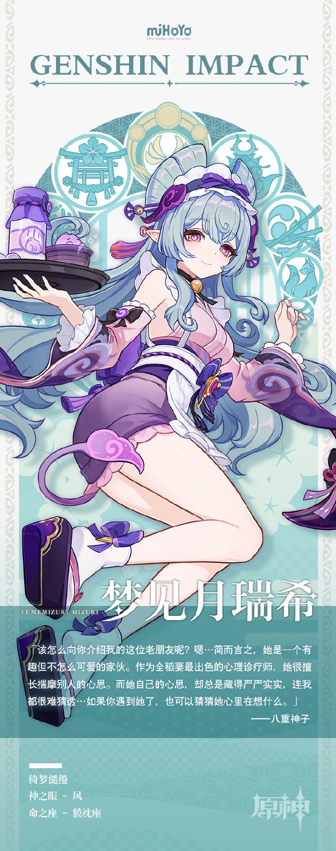 本篇为大家介绍原神5.4新角色梦见月瑞希的技能,这是一名五星风属性角色,她是稻妻数一数二的心理诊疗师,属于梦貘一族,借食梦貘的力量为人们驱散噩梦,带去安宁的心境。