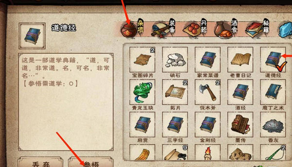 2、在杂项里面找到道德经,点击参悟,提高道学等级。