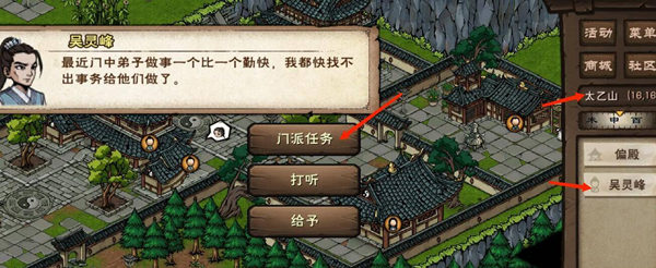 4,来到太乙山(18,16),跟吴灵峰对话,点击接取门派任务。
