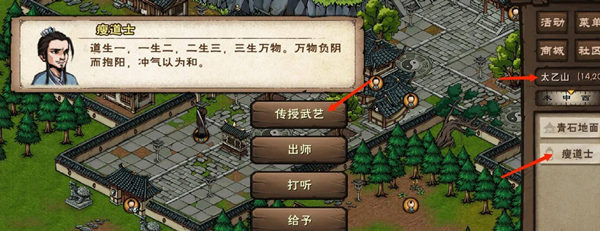 5、做完门派任务后就可以获得宗门贡献值了,再去找瘦道士对话,点击传授武艺就可以学习两仪剑法六重以后的内容了。