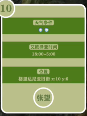 我们需要在碧空天气的18:00-4:59分来到格里达尼亚旧街x:10 y:6的地方。