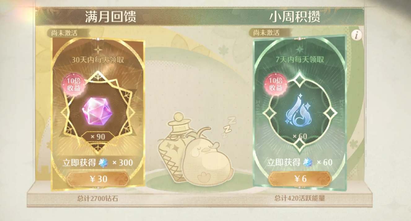 月卡30天可以获得90x30=2700钻石,换算下来是1.2r一抽,周卡获得60x7=420活跃能量(体力)
