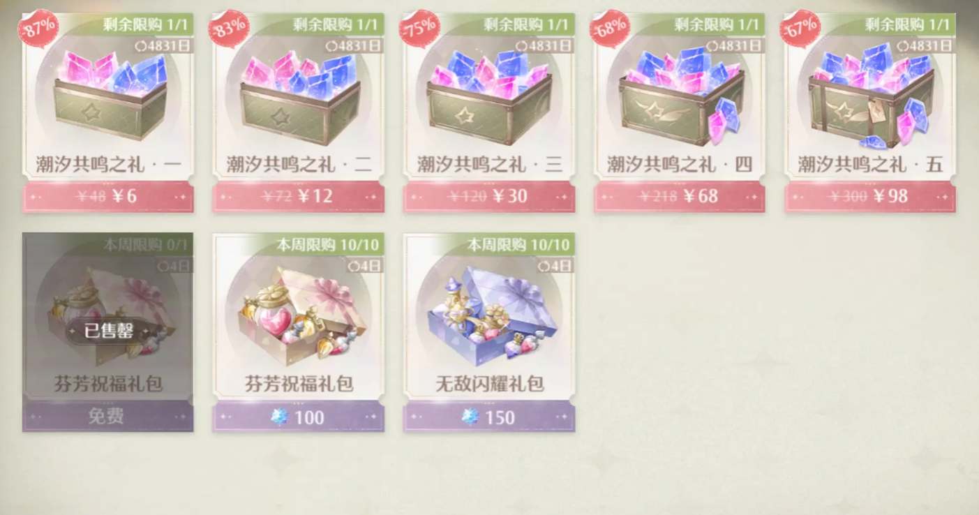 4、以上就是游戏中各种礼包的售价介绍了,一般来说如果游戏内开放新版本、新主题活动过的话还会上架一些性价比很高的限时礼包,玩家们可以优先购买折扣力度大的礼包来获取星石。