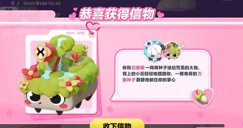 将石板板设置为跟随,然后切换不同的庄园,多切换几次就可以获得了。信物是万象种子。