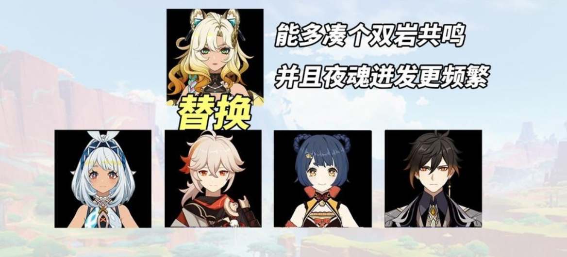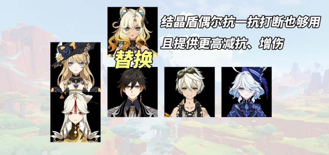 希诺宁替换队伍内的钟离,本身双岩体系+芙宁娜就有结晶护体,抗打断不是那么刚需,换成增伤减抗可以进一步提升队伍的输出上限。