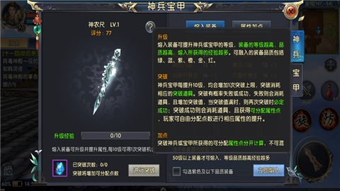 游戏中采取经验升级的方法让玩家更好的发展神兵宝甲,而经验获取的唯一方式就是通过熔入装备。作为上古神器,神兵宝甲可谓有一定逼格,必须50级以上装备才可熔入,装备等级越高,品质越高,熔入所获得的经验也就越多,所以玩家在日常副本或者任务中获得的装备千万不要再乱丢一气了,记得用来提升神兵宝甲的经验,也可以算是废物利用了。而且神兵和宝甲的经验槽是独立的,想必日后肯定需要大量装备补给。