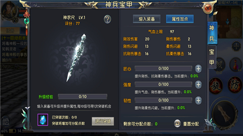 除了日常给神兵宝甲熔入装备升级外能提升属性,另外每提升10级可以进行一次突破,突破成功后还能额外获得可分配属性点,玩家可自由分配点数进行相应属性的提升,不过突破神兵或宝甲的属性点是独立的。这里就需要玩家根据自身职业特点进行加点了,坦克职业就推荐韧性,刺客职业就选择匠心,法师职业就选择强度,总之都是要让自身优势最大化。