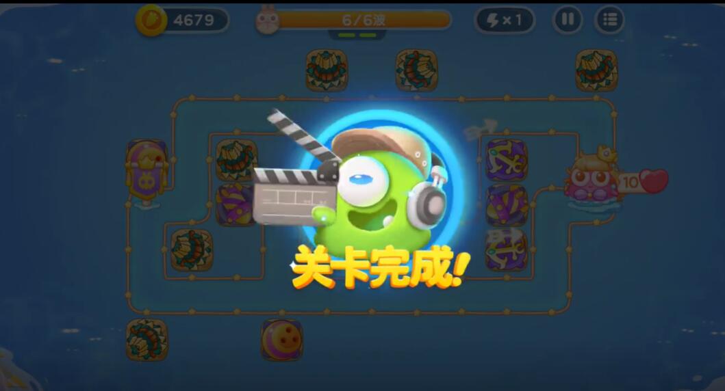 13、再出怪口的上方和下侧的水流的节点处建造两个保龄球对怪物进行输出,最后两波挂机即可完成关卡。