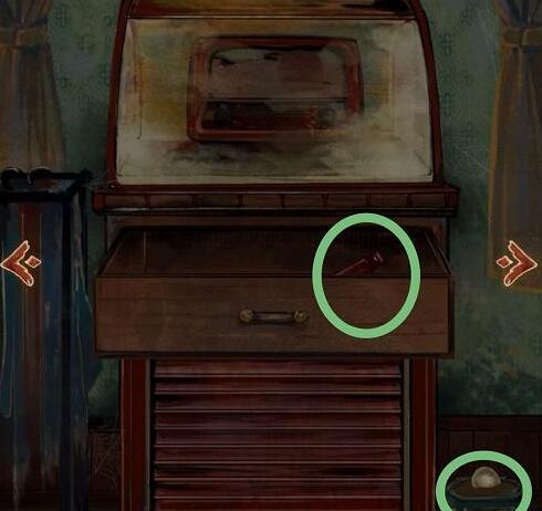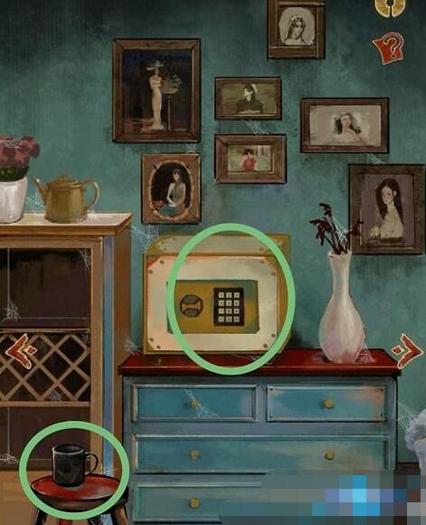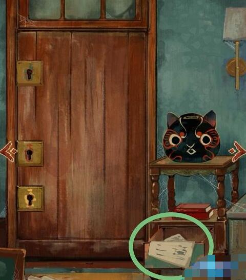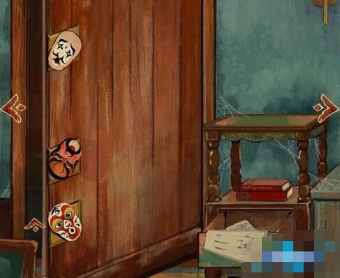 14、接着我们将桌子上烟灰缸砸向有3个钥匙门旁的黑猫罐子,获得第二个脸谱钥匙。
