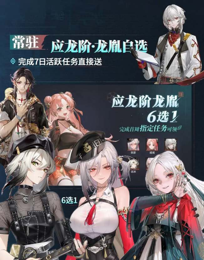 这个公测阶段登录并完成7日活跃任务就可以选择一个常驻角色直接获取了,可选择的角色列表如下: